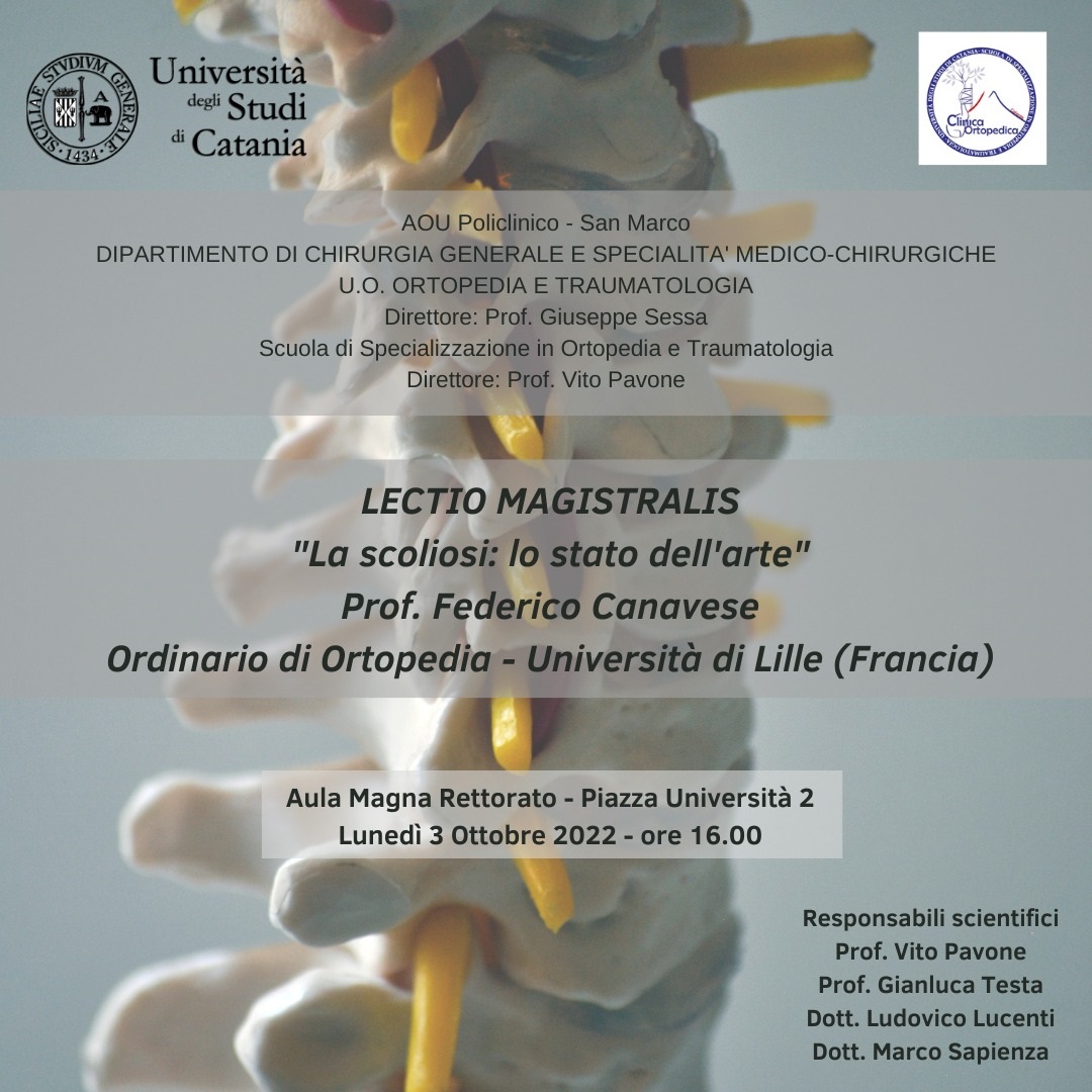 La Lectio magistralis è prevista per il 3 Ottobre 2022 alle ore 16:00 presso l'Aula Magna del Rettorato, dal titolo: La Scoliosi: lo stato dell'Arte.